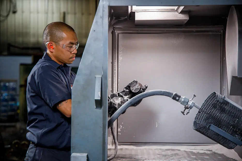 After your parts are heat treated, our blasting process eliminates scale and residue, adds texture to surfaces and helps strip away other contaminates that can be present after heat treatment. Blasting helps make your operations easier after heat treating such as machining and painting. It also gives parts an aesthetically pleasing matte finish. We also will blast parts that do not require heat treating.