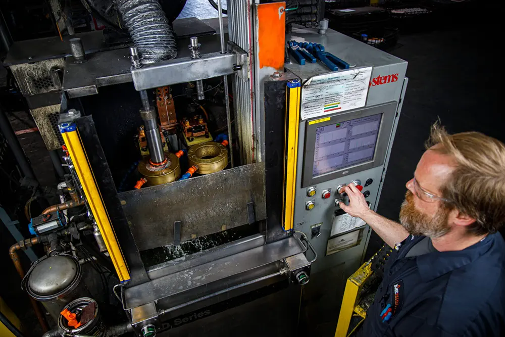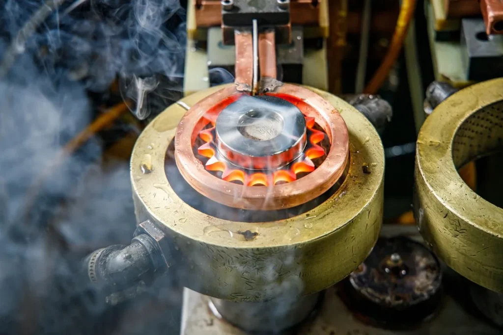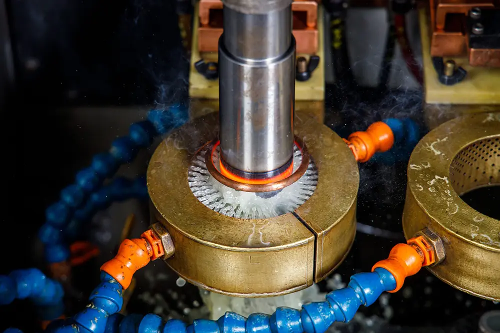 Induction hardening is a type of surface case hardening surface process that can be used in an isolated zone/area or harden the entire surface of a part. The process uses electromagnetic induction to rapidly heat and then quench specific/entire areas of a metal part. This creates a very hard outer “case” while leaving the inner “core” tough and ductile.